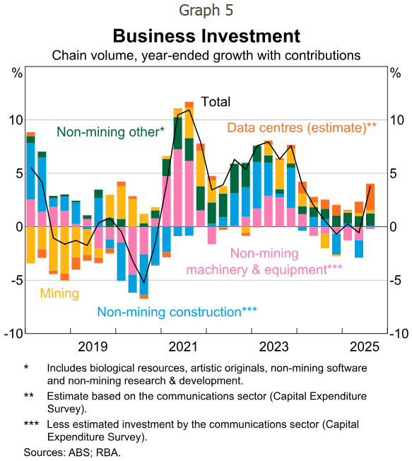 Those orange bars are the story and the signal, which is to say that a material share of the September quarter capex surge came from data centre buildouts. This was largely imported equipment, lumpy by nature, and directly tied to AI and cloud infrastructure expansion. At the time, the AUD was only buying 65-67 U.S. cents, making those lumpy purchases more expensive than they would be now, at around 71c to one AUD.