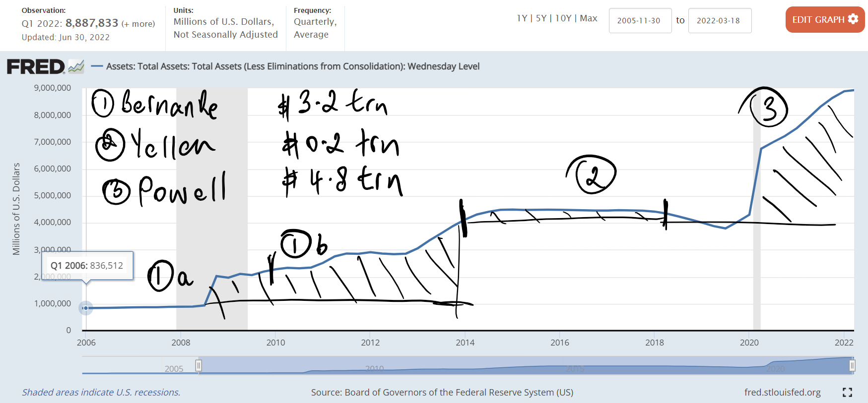 After that the balance sheet peaked at $8.9 trillion, more than 10x the size it was back in 2006. That’s the factual history.